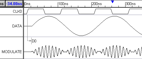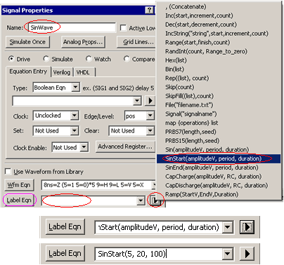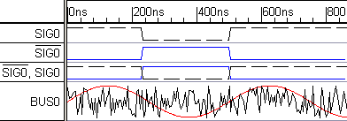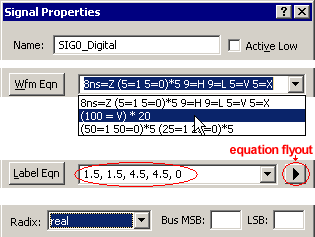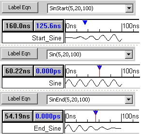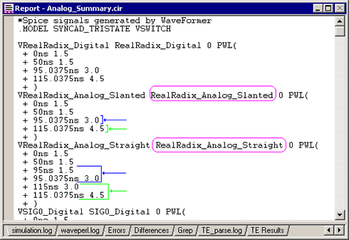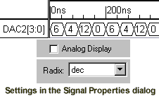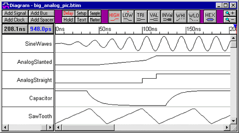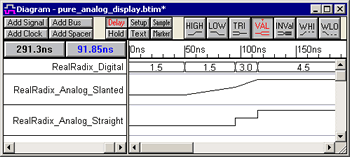 Analog Waveform Viewing and SPICE support SynaptiCAD's timing diagram editors and waveform viewers allow analog signals to be displayed, imported, created, and manipulated. WaveFormer Pro and DataSheet Pro also support exporting to SPICE. Digital signals can be converted to analog signals and vice versa (similar to the way analog-to-digital converters operate). There is also a tutorial called Creating Analog Waveforms that will help you work through some of the features. SPICE Export Spice Export is only available in WaveFormer Pro and DataSheet Pro, unlike analog waveform display which is supported by all of our timing diagram editor products. Analog Display Signals store analog data as digital valid segments with real floating point values. By checking the "Analog display" box in the Singal Properties dialog, the signal will display as an analog magnitude plot. The three signals in the diagram below have the same waveform values. Signal RealRadix_Digital is displayed as a digital waveform. The bottom two signals have their Analog Display checkboxes checked, so they draw as magnitude plots instead of as bus values. The second signal, RealRadix_AnalogSlanted, shows the waveform using the analog values of each segment drawn from point to point (piecewise-linear). The third signal, RealRadix_AnalogStraight, shows the waveform using the analog values of each segment drawn as step voltages. The setting for straight edges is located in the Analog Properties dialog. Draw Analog Waveforms Analog signals can be created by drawing valid segments and inserting floating-point or hexadecimal values for the segment states. However, most analog signals require a lot more data points than can be realistically drawn and entered by hand. One way to generate the signals is to use Waveform and Label equations. The timing diagram editors and veiwers can display differential (or superimposed) analog and digital signals. Each signal has a setting for color, line type (solid, dashes, ...), and line thickness so you can easily show the differences between the signals. Individually customize signal height to scale analog waveforms. Sine Waves, Capicators Waveforms, and Ramps Label Equations can be used to generate Sine wave signals, capcitor charging and discharging waveforms, and ramps. Just pick an equation from the equation flyout then replace the parameters with your values and the waveform will be automatically generated. Import Analog Waveforms - Import analog data from SPICE simulations, digital oscilloscopes, Mathematica, and MATLAB!