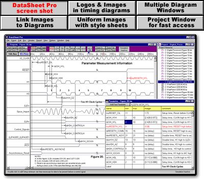 |  DataSheet Pro is SynaptiCAD's top of the line timing digaram editor, providing the ultimate environment for documentation professionals working with multi-diagram projects. Datasheet Pro's project management features allow users to efficiently combine diagrams from multiple engineers into one project with uniform formatting. Using Object Linking and Embedding (OLE), users can embed timing diagrams into other publishing programs. These images can be edited at any time directly from the publishing program by double clicking on the image to launch DataSheet Pro with the selected timing diagram. Other features include style sheets, view support, web-ready image generation, analog waveform import and display, and support for the industry-standard Timing Diagram Markup Language (TDML) format. Documentation professionals will be able to receive timing diagrams produced by design engineers using any TDML-compatible product, such as WaveFormer Pro or Timing Diagrammer Pro, and embed them directly into publishing programs like FrameMaker and Word. Check out DataSheet Pro's Feature pages: Evaluate and Purchase DataSheet Pro |