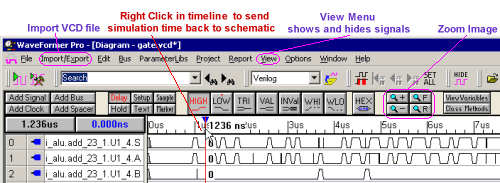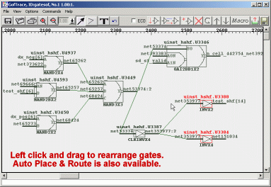 Netlist Analyzer and ECO tool Gates-on-the-Fly (GOF) graphically analyzes and edits large Verilog netlists that have been generated from a synthesis or layout tool. Netlists sometimes require changes to either meet timing closure specifications, fix functional logic bugs, or to repartition a design. Using GOF, you can easily find and view specific logic cones in your design on a schematic to visualize just the paths you need to see without unnecessary clutter. GOF also simplifies mapping from RTL level constructs to their gate-level equivalents, so that you can pinpoint the locations where changes need to be made. GOF's ECO mode supports both graphical and script-based editing features for tracking ECO changes. Metal-only ECO operations are also supported with an automatic spare gates flow. GOF has four main parts: a netlist browser (GofViewer), a schematic viewer (GofTrace), a netlist editor (GofECO), and a scripting program for automating changes (GofCall). You can also debug a design using one of SynaptiCAD's Waveform Viewers to annotate GofTrace schematics with state information from a waveform file (either from a simulation debug session in progress or from a VCD file created during an earlier simulation of the design). Below is a typical design flow using GOF: (1) Locate Sections of interest in the design in GofViewer GofViewer displays a netlist as a hierarchical tree of module instances with an associated text window. This is the first window opened after launching GOF from the command line. From this window, the design can be quickly explored by double clicking on the tree and viewing the code. Use the right click context menus and/or double click on objects to quickly find related information such as the drivers and loads of a particular net. GOF is optimized to handle very large netlists, so it only loads the module that you are looking at. (2) Investigate gates using GofTrace schematic windows Once a netlist is loaded, you can view sections of the design as a schematic using a GofTrace schematic window. GofTrace allows you to quickly display only the portion of logic that you are interested in by focusing on tracing just the fan in/out of a particular path, unlike other schematic tools which force a fixed placement of the gates that makes it difficult to rearrange the gates to visualize just the area of interest. Initially a schematic is drawn with straight wires between connections so that you can quickly view the circuit and get an idea of the gates and buffers that have been added by the synthesis tool. However, the nets can then be automatically routed using the Place & Route menus or manually routed with the Line Select Mode to produce quality documentation. Using one of SynaptiCAD's waveform viewers, you can view waveforms from a simulation or a waveform file (e.g. a VCD file) and also show specific logic states annotated on GOF schematic Windows. The schematic and the waveform displays are linked so that you can quickly display just the waveforms that match the nets of your schematic. You can also right click in the waveform window to send logic states at a particular simulation time back to the schematic. (3) Use GofECO to graphically edit the netlist gates and connections GofECO is a graphical method of changing a netlist. You can add, delete or replace gates. You can also add or delete connections between gates and adjust the drive strength of buffers. The schematic background changes color to indicate that the diagram is in ECO mode, and all ECO changes are displayed in a different color than the schematic gates and connections. (4) Use GofCall for automatic ECOs and Checking the Schematic Using GofCall's programming API, complicated ECOs can be performed with only a few lines of scripting code. The API lets the user focus on the logic changes, without having to specify all the details like adding hierarchical ports or naming new nets. The GofCall API statements can be entered through an Interactive Command window or executed using a batch file.