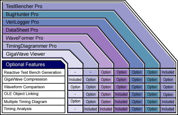 | SynaptiCAD's Software Options Transaction Analysis with PSL/Sugar Transaction Tracker is a PSL/Sugar-based verification tool for viewing simulation data as higher-level transactions, instead of as simple waveforms. Reactive Test Bench Generation Reactive Test Bench Generation uses a single timing diagram to generate a test bench that reacts to the model under test and generates pass/fail reports. GigaWave Waveform Compression GigaWave allows SynaptiCAD's products to view and edit very large simulation and logic analyzer waveform files. Waveform Comparison Waveform Comparison graphically displays the differences between compared waveforms for two timing diagrams or individual signals. OLE Picture Embedding OLE puts documentation professionals on the cutting edge by allowing timing diagrams in TIM or TDML format to be included directly into data sheets. Multiple Timing Diagram Window Option Multiple Timing Diagram Window option enables the user to open and edit mulitple timing diagrams simultaneously. Timing Analysis Upgrades the waveform editors to the same timing analysis engine that is included with the timing diagram editor product. It supports delay correlation, reconvergent fan-out, and clocks that model jitter and buffer delays. The figure below indicates which options are available or included: |
