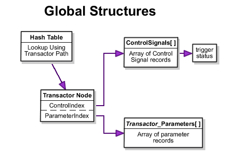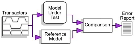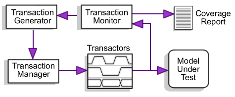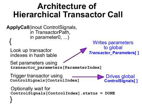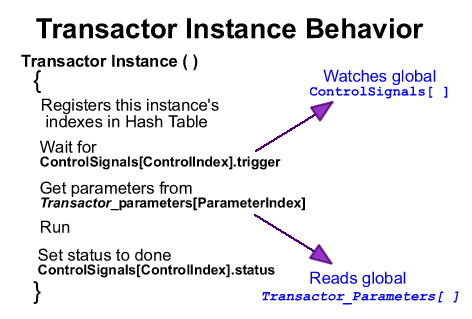 VHDL and Verilog do have some limitations when using these pseudo-class techniques. In Verilog, to pass a class instance into a module, it must first be converted into a bit array. Then, inside the task it must be converted back into a module instance. This means an additional module instance must be created that is available from the scope of the task that can be used to convert the bit array that was passed in to a data structure. Also, Verilog and VHDL pseudo-class solutions lack more advanced features available in C++ classes such as data hiding, inheritance, and polymorphism. Developing transaction generators and managers to stimulate a design Once transactors have been created for a BFM, a transaction generator must be created that can generate the different types of transaction calls and the inputs for the transaction calls. The transactions are typically a mix of directed tests used to setup and test specific functionality combined with long runs of randomly generated transactions to catch any problem cases not caught by the directed tests. Constrained random testing is used when a system has too many potential input sequences to test all possible input sequences (a typical situation for virtually all system level designs) because they save time compared to manually writing the huge number of directed tests that would otherwise be required. The term constrained random is used to refer to randomly generated transactions that are constrained by the generator to meet some requirements on the randomly generated values. Typically the constraints are that the parameters to the transaction are logically consistent with one another and with respect to the transaction protocol and the implementation of the design under test. For example, the address values to a read transaction might be constrained so that most of them are within the address space of the device under test. By constraining the parameters in this fashion, fewer transaction test vectors need to be generated to test the system, reducing the overall run time of the test bench. Using hierarchical references to transactors When generating master transactor calls to test your design, it is frequently useful to be able call transactors that are located in different BFM instantiations. For example, a higher level BFM may contain several ATM port BFMs with SendPacket transactors that need to be initiated from the higher level BFM. This requires that the transactors be hierarchically addressable from the higher level BFM. Hierarchical referencing of transactors is supported natively in Verilog and easily done in C++, but it is not natively supported in VHDL. Below is a technique that can be used to emulate hierarchical referencing in VHDL. Although this technique is discussed for the purpose of supporting hierarchical function calls to transactors, it can also be applied whenever a testbench requires hierarchical access to components of the design. The basic idea behind hierarchically accessible transactors is to create a global array of control signals, one for each transactor instance. As each transactor initializes itself, it registers itself with a hash table that maps from the transactor instance hierarchical name to the appropriate index into the control signal array. Additional arrays are also needed to store the parameters for each type of transactor. Generics can be used to pass down through the hierarchy the instance name strings to each transactor instance. The figures below show the flow of control for the transactor and the Apply function that initiates a transaction on the transactor:    Using a transaction manager queue to mix transaction streams For simple test sequences, you can execute a series of transactors from a single process, one after the other. If you want multiple transactors to execute at the same time, then you can use non-blocking calls to the transactors. But, if you want to have multiple sequences of transactions running in parallel, then you must develop a more involved transaction sequencer. One solution is to create a process for each sequence of transactions that you want to run in parallel. But, this is limiting in situations where you need to have control over all the types of transactions to run in one process. For example, in order to fully exercise an ATM switch, you need to send ATM cells to each input port simultaneously. Also, randomly determining the port number and ATM cell data to transmit can enhance the test bench. So, it would be nice to be able to generate X number of cells to send and transmit them to the switch through random port numbers. And while doing this, not allowing one particular transmitter to block another. So, a second solution is to create a transaction manager that reads transactions from a queue and executes them one after the other. You could have one transaction manager instance per port and place transactor calls randomly into their queues. In Verilog, this is difficult to do and beyond the scope of this paper so we are just going to cover how to implement this solution in VHDL and C++. In VHDL, you can implement a transaction manager by using the "hierarchical referencing" technique above and by creating the following: 1) an additional record type, TApplyCall that stores a Transactor Node and the transactor's parameters, 2) a queue of TApplyCall's, 3) functions that can be used to place TApplyCall's on the queue, and 4) a process that will read TApplyCall's from the queue and use them to execute a transactor. The transactor parameters can be represented using a "line" in VHDL so that TApplyCall can be used for all types of transactors. Then, you would add a data member to the Transactor Node that represents the type of the transactor that the transactor manager can switch on to determine what method to call to run the transactor. That method would be responsible for extracting the appropriate parameters from the parameters "line" and executing the transactor usin