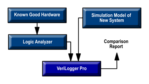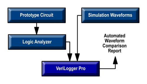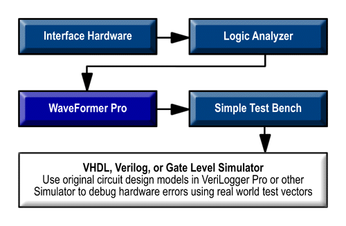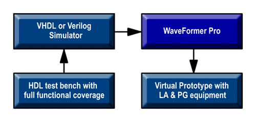 Fusing Hardware and Simulation Test Bench Development with Virtual Prototyping Techniques Designers are looking for new methods to reduce verification time for both simulation models and hardware prototypes. In many ways both of these environments suffer from the same problems of test vector creation, test coverage, analysis of results, and detection of elusive timing problems. There are many EDA tools and hardware test systems available to help solve these problems in each environment, but in the past there has not been a way to leverage the work done in one environment into the other. In this paper, we propose several techniques that unite the worlds of simulation and hardware verification and which take advantage of strengths offer by each environment. 2.0 Basic Virtual Prototyping Setup Our proposed solution uses a technique called virtual prototyping, which employs a combination of pattern generators, logic analyzers, and EDA software. Figure 1 shows the basic virtual prototyping setup. SynaptiCAD offers products that can act as two way waveform translators between the simulation and hardware environments and provide an analysis platform for comparing and measuring the results. Virtual prototyping techniques are divided into two categories: EDA-assisted hardware verification and Hardware-assisted simulation verification.  Figure 1: Virtual Prototyping Setup 3.0 EDA-Assisted Hardware Verification In the following virtual prototyping setups, we will show several ways to leverage the work done during the design phase of the product to simplify the development of a hardware test environment. These include: using waveform data from the simulation phase to generate pattern generator stimulus, comparing captured waveform results against simulated results to detect hardware errors, and using the simulation environment to help troubleshoot detected errors. 3.1 Generating Stimulus for Pattern Generators Programming a pattern generator with enough stimulus to adequately exercise a hardware prototype has traditionally been a very labor intensive and error prone process. SynaptiCAD's WaveFormer Pro eliminates this problem by allowing the reuse of waveforms from the simulation phase to serve as the waveform stimulus. In addition to direct translation, WaveFormer can generate stimulus waveforms using a combination of graphically drawn signals, timing parameters that constrain waveform edges, clock signals, and temporal and Boolean equations for describing complex, quasi-repetitive signal behavior. Advanced operations on signals such as time scaling and shifting, and block copy and pasting of signal behavior over an interval of time are also supported. This simple, but powerful environment dramatically eases the labor associate with the generation of complex stimulus. The resulting hardware test benches also have the same functional coverage of the simulation models ensuring that the hardware prototype is adequately tested. Figure 2 shows the design flow for the test bench conversion.  Figure 2: Creating Stimulus Vectors for a Pattern Generator 3.1 Verifying Hardware Response with Simulation Compare Traditionally, waveform data from a logic analyzer has required visual inspection by an engineer familiar with the operation of the circuit to verify proper operation or to troubleshoot an error. As the number of waveforms and the amount of data captured increases manual inspection is no longer feasible due to the sheer amount of data that must be analyzed. SynaptiCAD's VeriLogger Pro software overcomes this problem by providing a set of automated comparison functions with the ability to compare logic analyzer data to simulation results as shown in Figure 3. Automated comparison guarantees a rigorous check of each data point, ensuring the detection of "small impact" errors that are easily missed during visual inspection of the waveforms. Another important advantage of automated verification is it reduces the amount of knowledge required by the verification engineer to test the system. Rarely does even the designer of a system keep a detailed vision of the operation of all the signals in his design (that's the reason for simulators), yet that is exactly the capability needed to spot a hardware error. The simulation environment, however, knows exactly how the signals should be acting, so it is the ideal tool for identifying any differences between the actual response and the correct response.  Figure 3: Verifying Hardware Response using the Simulation Results 3.3 Simulate and Visualize Acitivity on Internal Nodes One of the most frustrating problems encountered when debugging a circuit is the inability to see what is happening on all the internal signal nodes of an FPGA or ASIC. A logic analyzer can only show the activity on signals that are brought out on device pins. Unfortunately, many designs are I/O limited. Even when there are no limitations, there are almost never enough pins available to bring out all the useful nodes. To combat this problem, WaveFormer Pro contains a built-in interactive simulation engine that can simulate registered logic equations like those used in FPGAs or CPLDs. Engineers can quickly generate internal signals to check specific points. If a broader view is needed, then WaveFormer can generate a VHDL, Verilog, SPICE or gate-level stimulus file which can be simulated with the original design models to view the entire circuit operation. 3.4 Find Elusive Setup and Hold Violations Another benefit of combining a simulation environment with a hardware prototyping setup is the ability to generate complex timing analysis reports. For example, the simulation environment can generate a report of ALL setup and hold timing violations specified between any two signals in a timing diagram regardless of whether this signal is a captured waveform or a simulated waveform (logic analyzers typically only flag the first violation). Setup and hold time violations in ASICs and PLDs are particularly