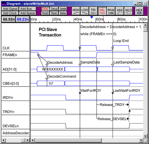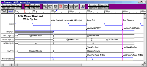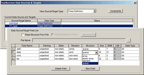 Finally, A Verification GUI! Graphical Code Generation Solves Verification Problems Verification design complexity will force many of you to reconsider your current methods of creating test benches. But the available choices are difficult to evaluate. Will you stick with a modeling language like VHDL, Verilog, or SystemC? Or will you switch to one of the new verification languages such as OpenVera or the "e" language? Whatever choice you make, you are still faced with the problem of developing complex test benches, and maintaining that code over the course of several projects and possibly several verification engineers. Graphical code generation offers a language independent solution to test bench development that enables engineers to quickly describe test benches in a manner that is clear and precise. Graphical test bench generation is the process of automatically creating test bench source code from an interface description and the bus transactions supported by the user's model. Instead of entering the test bench code by hand, the developer sends his HDL model under test to a test bench generator, which automatically extracts the port interface signals of the design into a timing diagram editing environment. This timing diagram editor is then used to create timing diagrams that describe the bus transactions for the test bench. By automating the most tedious aspects of test bench development, engineers can focus on the design and operation of the test bench rather than the painstaking aspects of code development. Advanced Modeling SynaptiCAD has developed TestBencher, a simple and intuitive graphical test bench generator that can be used to model very advanced bus transactions and interface descriptions. Pipelining, split-phase transactions, data structures and memories, and sequence recognition can all be modeled. TestBencher uses the timing diagrams to generate bus transactor source code in the user's preferred verification language. By using timing diagrams, the engineer can work at a higher level of abstraction, free from the coding details that arise solely from the choice of a particular verification language. In the following sections we will examine some of the common problems that occur during functional verification and discuss how these problems are alleviated by graphical generation of the test bench code. Race Conditions Test benches are frequently plagued by concurrency and synchronization issues that cause race conditions and non-deterministic execution. While these issues are simple enough in theory to overcome, in reality they are extremely difficult to manage when coding by hand. One reason is that race conditions are caused by subtle design choices that cannot be automatically found in the same way that syntactical errors are. These conditions only manifest at run time. And often they are not even detectable at run time because the race conditions may "go the right way" on a particular simulator, only to fail when run on another simulator which made a different decision on the order in which to execute the theoretically parallel operations. This poses a particular problem for IP vendors who need to distribute test benches to customers using simulators from different EDA vendors. Even when running on the same simulator, these sorts of race conditions can cause problems, because it is quite possible that a future release of the same simulator may change the order in which it executes processes to enhance simulation performance, leading to a severe maintenance headache. Using a graphical code generator, circumstances that can cause race conditions are handled automatically. For example, race conditions are common in clocked functional test benches where signals are frequently driven and sampled at the same clock edge, but on different zero-time delta cycles. Figure 1 shows a simplified example of one way these races can occur. When hand coding, the engineer must be sure to write the code in such a way that the sampling occurs as the first thing that happens during each clock cycle. This is not an easy task in hardware description languages where signals frequently change state several times during a single clock cycle. However, the concurrent events that cause these race conditions are visually obvious in a timing diagram, leading to the easy avoidance of these types of race conditions.  Figure 1: Simple Race Condition Constrained Random Data During the implementation of a hand-coded test bench it is very easy to mismatch port sizes or make other similar small errors. Automatic code generation from graphical descriptions makes it easier for an engineer to define the information in one location and use it throughout the test bench. This is especially true for creating and maintaining complex data structures that are used to supply or store state information for different transactions. A small change to a data structure often causes code changes in many different locations in the test bench. With a graphical interface, once a data structure has been defined for a project, changes to that data structure are automatically propagated throughout the test bench. The newer verification languages also support advanced data structure features such as constrained randomization of test stimulus during a simulation. With a graphical interface it is very easy to experiment with different randomization options because data structure changes are made in only one location. The example in Figure 2 shows the definition for a data structure that will provide constrained randomized data to a transaction. The fields specified for a data structure can be elements, arrays, or queues. Each field can have different properties defined, depending on the test bench language and the data type being used.  Figure 2: Complex Data Structure using Constrained Random Data TestBencher also provides the capability of easily creating complex data structures which allow data to be read from or written to a fi