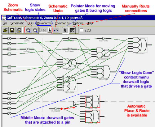 | New Product Press Release, August 21, 2009 Gates-on-the-Fly Netlist Editor and Schematic Viewer SynaptiCAD announces the release of Gates-on-the-Fly (GOF), a Verilog netlist editor and incremental schematic viewer. GOF can edit very large netlists from a synthesis or layout tool that need changes to either meet timing closure specifications, fix functional logic bugs, or to repartition a design.  Locate Areas of Interest in the GofViewer window Users begin navigating through a netlist using GofViewer. GofViewer displays a netlist as a hierarchical tree of module instances with an associated text window that displays the actual netlist code. Nets and modules are hyperlinked so that double clicking will either: open up the definition of the object or display a leaf cell in a GofTrace schematic window. Right-click context menus provide functions for finding related loads, drivers, fanin, fanout, parent modules, etc. GofViewer also has an RTL-to-Netlist Matching feature to ease the process of locating nets in the netlist code that match signals from the original RTL code. Investigate logic paths using GofTrace schematic windows GofTrace is an incremental schematic viewer that lets designers quickly display relevant gates along a specified logic cone (set of related circuit paths). This is unlike other schematic tools which force a fixed placement of the gates that makes it difficult to rearrange the gates to visualize just the area of interest. A schematic can easily be expanded to examine a path of interest by middle-clicking on a pin to show the nets/gates connected to the pin.  Graphical and Script-based Netlist Editing GofECO is a special mode of the schematic window that lets you make changes to the netlist. Once ECO mode is activated, the ECO buttons will take over many of the schematic features like saving files, undoing operations, and adding or deleting gates and nets, to ensure you are aware that the actual netlist is being changed and not just the schematic view. In addition to graphically performing ECOs, there are also two scripting methods for performing ECO operations: Logic Cone ECO and GofCall API scripts. The Logic Cone ECO interface accepts a script that changes the entire logic cone that drives a particular part and replaces it with a newly re-synthesized netlist. The GofCall API mimics most of the graphical ECO commands. The GofCall API lets the user focus on a set of desired logic changes, without having to specify all the low-level details involved in making the changes (such as adding hierarchical ports or naming newly created nets). Pricing and Availability Gates-on-the-Fly is available on Windows and Linux. A perpetual license sells for $5000 on Windows (special introductory pricing is available for the next 90 days). Leasing options are also available. For more information, contact SynaptiCAD at phone (800)804-7073 or (540)953-3390, fax (540)953-3078, email: sales@syncad.com, web www.syncad.com Marketing Contact For any questions concerning this press release please contact Donna Mitchell at 540-953-3390 or email at donna@syncad.com. High-resolution images can be downloaded directly from SynaptiCAD's web site at www.syncad.com. |