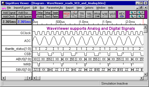 | Press Release for major product update: May 24, 2006 SynaptiCAD Updates Free Waveform Viewer SynaptiCAD has upgraded WaveViewer Pro, a free waveform viewer. WaveViewer Pro v11.0 can display compressed analog and digital waveforms imported from Verilog, VHDL, SystemC, and SPICE simulation results and data captured with test equipment such as logic analyzers and oscilloscopes from Agilent and Tektronix. SynaptiCAD also offers a commercial version of the viewer, GigaWave Viewer, which allows loading multi-gigabyte files.   Binary Format Speeds Waveform Loading WaveViewer v11.0 can save waveforms to SynaptiCAD's proprietary compressed waveform format, BTIM. The BTIM format is typically about 200x smaller than an equivalent VCD file and loads 500x faster on subsequent reloads of the waveform data. The compression algorithms operate on both analog and digital data. Faster Simulations with Direct BTIM Waveform Dumping The new viewer also includes a PLI application that can directly generate BTIM files from Verilog and VHDL simulators. By directly dumping to BTIM, simulations can be speeded up by 3x compared to dumping to a VCD file. The BTIM PLI library supports the following simulators: SynaptiCAD VeriLogger Pro, Mentor Graphics ModelSim, Aldec ActiveHDL, Cadence Incisive, and Synopsys VCS. Selectively Load Signals With Filter Files The updated viewer offers the ability to create "filter files" for selectively loading signals from a waveform file and reordering the signals. Filter files allow users to see only the waveforms they want to see, without having to select and reorder them every time they run a new simulation. Filter files also allow properties to be attached to the waveforms that are not supported in the native format being imported into WaveViewer (for example, voltage levels can be attached to signals loaded from a VCD file). Other new features include: - A new Show and Hide dialog that makes it simple to control which signals are visible or hidden in the diagram. Select signals either graphically or with regular expression pattern matches