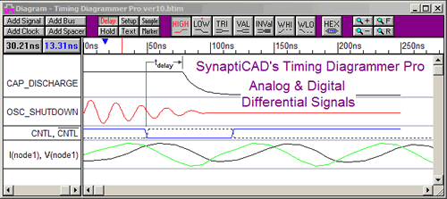 | Press Release for major product update: November 17, 2005 SynaptiCAD celebrates 14 years of Timing Diagram Editor Development SynaptiCAD is proud to announce version 10 of Timing Diagrammer Pro, our premier timing diagram editor and timing analysis engine. This version includes over a dozen features to improve the customization, imaging, and visualization of timing information. After 14 years of continuous development, these features smoothly combine with Timing Diagrammer Pro's drawing environment, allowing users to create timing diagrams that fully express and analyze the critical path timings in any system.   Differential Signals One of the new timing analysis features is the ability to display differential signals. Since Timing Diagrammer Pro supports both analog and digital display of signals, the differential signals can be used to show everything from complex bus behavior to signal transition capacitance. This feature also ties in with the new ability to set the color and line style of individual signals, so both on-screen and printed copies distinctly show the difference between the superimposed signals. More Appearance Control Although Timing Diagrammer Pro is primarily intended as a design tool, it is also used to create documentation for timing specifications and data sheets. Several features have been added to improve look and printing of the timing diagram. Text objects now have left, center, and right justification and also the ability to overwrite graphics they float over to make the text easier to read. The parameter table display has been made customizable with control of column names and appearance. Creation of common analog waveform data such as capacitive charge/discharge, ramps, and sine wave oscillation has been simplified with new label equations. The size of encapsulated Postscript image size is directly settable by the user and can be made larger than A-size paper. Third party Interface control Version 10 also sports a CORBA API interface that enables third-party applications to use the tool as a waveform viewer and editor. Several companies are using the CORBA interface to incorporate waveform viewing, editing, and analysis into their products on an OEM basis. In response to requests from OEM customers, SynaptiCAD has also accelerated the display of large waveform data files and the expansion and collapsing of bus information. General Features Other notable new features include support for USB hardware dongles, faster startup on UNIX platforms, and CUPS printing support. Timing Diagrammer Pro is available for Windows, Linux and Solaris platforms starting at $1,500. For more information, contact SynaptiCAD at phone (800)804-7073 or (540)953-3390, fax (540)953-3078, email: sales@syncad.com, web www.syncad.com Marketing Contact For any questions concerning this press release please contact Donna Mitchell at 540-953-3390 or email at donna@syncad.com. High resolution images can be downloaded directly from SynaptiCAD's web site |