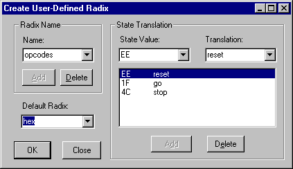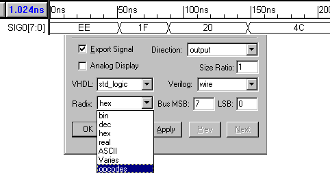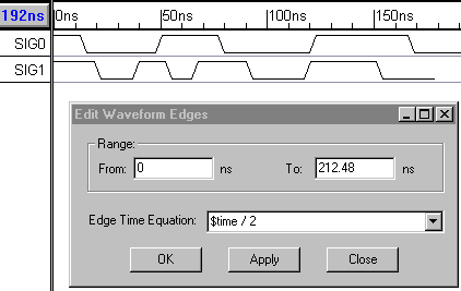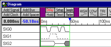 Drawing and Editing Waveforms 7 Graphical States: Quickly draw waveforms using the seven graphical states (high, low, weak high, weak low, tri-state, valid and invalid).  Clock Support: Clocks are drawn automatically. The user sets the clock rate, duty cycle, jitter and buffer delays.  Check timing constraint requirements: Parameters actively move and monitor signal transitions.  Block Copy: Copy sections of a waveform and place (insert or overwrite) anywhere in the timing diagram.  Time breaks for Time Compression: The time breaks can be used as a graphical display tool or as a true time compression marker. The compressed time still exists, but is not displayed on the screen. There are three different styles of time breaks: dotted, curved and jagged that emulate the most common time breaks used in data books.  Multi-Bit Bus Support: Any changes made to the bus will be reflected in the member signals.  Map Bus Values to OpCodes: User-defined radix dialog allows you to map state values to "human-readable" names.   Scale, Offset and Manipulate Waveform Edges: Waveforms are scaled, offset and manipulated using mathematical formulas from within the timing diagram editor.  Other Features: - Multiple Undo/Redo: Undo multiple previous drawing and editing actions.