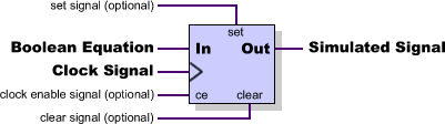 {SIG[3:0], SIG1[7:4]} Register and Latch Settings The interactive sumulator supports registered and latched equations. Below is an example of the circuit that is being modeled.  The logic wizard in the Signal Properties dialog is used to enter information about the circuit. To use a register or latch just enter a Boolean equation, a clocking signal, and choose the triggering for the clock signal (rising edge, falling edge, both, high, or low). Other settings can be used to describe the control lines for the flip-flop like the clock enable, set and clear signals. These control lines can be active low or high and synchronous or asynchronous depending on the settings in the Advanced Register and Latch Controls dialog (see next bullet). - Model simple 4-bit "rollover" binary counter