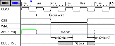 Code complexity greatly increases when response checking code and parallel execution blocks are added to a transactor. In the previous example, only one process block is needed to represent the transaction. However, if you wanted the transaction to sample the first edge transition of CSB then do a conditional delay of the csb2dus, the transactor has to be coded like a finite state-machine. This type of coding is very difficult to read, however the timing diagram is still easy to interpret. Automatic Tracking of Signal and Port Code One of the most tedious aspects of working with HDL languages is maintaining the signal and port information between the test bench and the model under test. Signal information is repeated at several levels of the test bench, so a change in the signal information requires a tedious rewriting of the test bench code. Test bench code is more difficult to maintain than a regular design model because the code is not broken apart into simple units. Each timing transactor usually drives and monitors most of the input/output port signals of the model under test. TestBencher solves this problem by maintaining the signal and port information for all the timing transactions and the model under test. With TestBencher Pro, a signal change is made in one place and then automatically propagated to all the places where that code needs to be represented. Without this capability, port-connection errors can easily arise leading to subtle, difficult to debug errors, similar to the problems that arise when pins are misconnected on a circuit board. Conceptual Modeling Constructs TestBencher is easy to use because we have taken great care to keep the number of constructs down to a minimum. There are 5 basic constructs that are used to create a transaction. It is easier to learn the functionality of these 5 graphical constructs than it is to figure out how to out how to code manual equivalents into a transactor model. - Drawn Waveforms - describes stimulus and expected response