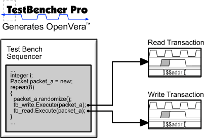 TestBencher Pro OpenVera Support TestBencher Pro provides designers with a graphical environment for generating OpenVera cycle-based or time-based bus-functional models from language-independent timing diagrams. With TestBencher you can upgrade your verification flow to include the power of the OpenVera hardware verification language. OpenVera provides powerful constructs for handling sequence recognition, arbitration, and comprehensive dynamic coverage analyses that are not available in VHDL or Verilog. TestBencher Pro.s graphical interface speeds up test bench development for both expert and novice users. TestBencher generates all of the low-level transaction code, verification code, sequence detection, error reporting and file I/O code. The graphical representation also enhances the ability of engineers to share data across projects, even for new engineers that are not yet familiar with the OpenVera language.  TestBencher Pro OpenVera Design Flow TestBencher Pro generates OpenVera test benches directly from timing diagrams. The test benches use a bus-functional model architecture enables test bench models to created from data contained in component data sheets. Additionally, TestBencher's graphical representations and automatic code generation remove, or abstract, coding details away from the user. This abstraction reduces the amount of time needed for test bench generation. Automating the most tedious aspects of test bench development allows engineers to focus on the design and operation of the test bench rather than the painstaking aspects of code development. The generated test benches are compiled with the Synopsys.s VERA tool and simulated using all major VHDL and Verilog simulators. System Level Design TestBencher Pro generates the entire test bench using the graphical timing diagrams, information extracted from the model under test, and the top-level test bench file. The only code that the user writes is at the system level; all of the other code is automatically generated. In the sequencer process of the top-level test bench file, the user will specify the order and logic for applying the timing diagram transaction procedure calls to the model under test. TestBencher can automatically generate the transaction code and the OpenVera data structures needed for the transactions, so users can concentrate on the functionality of the top-level test-bench.  Graphical Samples Generate OpenVera Expects TestBencher Pro features state and timing protocol checker generation for verifying the response of the model being tested. TestBencher.s sample construct can check the state of a signal at a given point in time or over a window of time. Samples can also check for either a state change or for stability during the sampling window. Sample window intervals can be specified as an amount of time or number of clock cycles (to support cycle-based test bench generation). Samples are also used to verify a sequence of events. For example, they can be used to synchronize the diagram to an event on a control signal and then conditionally store data in various types of data targets. OpenVera restricted, simple, and full expects are generated based on the way the waveform beneath a sample is drawn. The sampled data can be used later in the same transaction, other transactions, passed up to the top-level test bench, or saved to a file. OpenVera Advanced Data Structures Supported TestBencher Pro also supports various .data sources and targets. that allow the user to easily read data from and write data to table-formatted files, queues, arrays, and associative arrays. Data sources and targets enable storage and manipulation of complex data structures that are useful for modeling packet-based protocols. This feature is particularly useful when generating bus-functional models to test devices on a communications bus. TestBencher Pro.s Class Definition dialog is used to create OpenVera User Defined Types (UDTs) which can contain queues, arrays, associative arrays, and single elements of basic OpenVera types and other UDTs. Each field can be optionally defined as random, so that the OpenVera randomize function can fill the packet with data. Each field can also be defined as static so that one memory location is shared by several instances of the class. OpenVera.s Mailboxes are used to implement queues, so all of the functionality of Mailboxes is made easily accessible. TestBencher generates the code for the definitions and instances of these UDTs and basic OpenVera types. The instances can also be created as a queue, array, or associative array. Variables can also be created locally within a particular transaction. Other Features Other features include automatic port and signal extraction from HDL models, parameterization of both state and timing values through function call parameters or data files, checkers for signal stability and/or edge transitions within a window of time, and conditional application of edge transitions based on these checks. "We wanted to upgrade our verification flow to include the power of the new verification languages like OpenVera, but we were reluctant to incur the down time necessary to learn the language. Then we discovered TestBencher Pro's graphical verification environment and were impressed with the speed in which we could quickly develop a VERA test bench," said Cecil Stone, senior verification engineer at Lucent Technologies. "Also TestBencher Pro's language independent timing diagrams let us quickly generate Verilog test benches to perform timing tests on the same models." Summary The innovative combination of TestBencher Pro and VERA delivers a consistent and quick solution to the most demanding verification problems. This integration allows designers to focus on the verification of the device under test and not on the implementation of the test bench. |