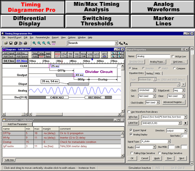 |  Timing Diagrammer Pro has everything that you expect in a timing diagram editor: a modeless drawing and editing environment; delays, setups, and holds for performing timing analysis; time markers; seven graphical waveform states; virtual and group buses; clocks with formulas; as well as a variety of ways to document your work. A great timing analysis tool at a great price, Timing Diagrammer Pro is a must-have for any engineer. Basic Timing Diagram Editor Features: Upgrade to more advanced Timing Diagram Editors: Customer Feedback Philip Nowe, a WaveFormer Pro user, wrote an article for Circuit Cellar magazine describing the importance of timing analysis and some of the techniques and tools available for doing timing analysis. What is timing analysis? Why is timing analysis important? How do you perform timing analysis? The article Timing (Analysis) is Everything: A How-To Guide for Timing Analysis was published in November 2003. Evaluate and Purchase Timing Diagrammer: Would you like a quick walk-through of Timing Diagrammer Pro? Download the evaluation version, call 800-804-7073 and ask for Gary. He will give you a brief tour which covers important areas like: drawing waveforms, creating multi-bit buses, documentation techniques, and working with parameters. French translation: timing diagram editor |