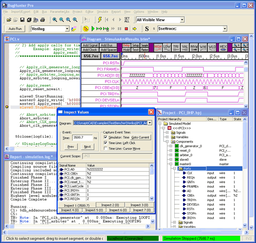 Graphical Debugging for Verilog, VHDL, and C++ simulators BugHunter uses the SynaptiCAD graphical environment and supports all major HDL simulators. It has the ability to launch the simulator, provide single step debugging, unit-level test bench generation, streaming of waveform data, project management, and a hierarchy tree. The unit-level test bench generation is unique in that it lets the user draw stimulus waveforms and then generates the stimulus model and wrapper code and launches the code. It is one of the fastest ways to test a model and make sure that everything is working correctly. The debugger also has exceptional support for VCD waveform files. With an integrated debugging environment you can graphically build a project, launch a simulation, and view the results in just a few minutes. The interface also manages the test bench interface so that it is easy to create a set of regression tests to run the design through.  Debugging Interfaces BugHunter Pro graphical debugging interfaces provide many different ways to view simulation results and track down errors: - Waveform window displays both the simulation results and the stimulus waveforms for the test bench generation.