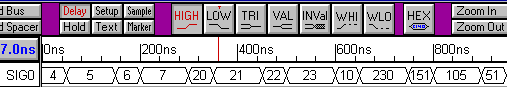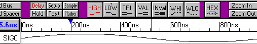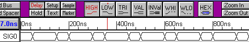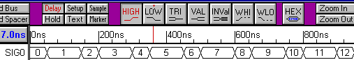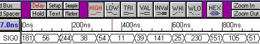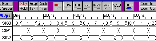 Label Equation Functions WaveFormer's Label equations are a great way to quickly create/edit complex stimulus vectors. Label equations generate state values on a signal's segments. Below are some examples of waveforms that can be created using the combination of Waveform (temporal) equations to set edge transition times and Label equations to set state values. Once you start using Label equations, you will find that you will be able to rapidly generate waveforms that would take hours to create by normal means. Generate a Series of Random State Values Label Equation: RandInt(80,255) Generates an array of 80 random integers within a range of 0 to 255 (inclusive).  Import States from an Existing Signal This is an easy way to import state values generated in a program such as MatLab®, Mathmatica®, or a user-written C program.  Label Equation: File('vectors.txt') Import a set of state values from the file vectors.txt. Copy States from an Existing Signal The Signal function generates an array of states from an existing signal. It takes one optional argument, the name of the existing signal. If no signal name is specified, the states of the signal being operated on are used (this is particularly useful for incrementally executing a series of label functions if you want to see the results at each stage). Label Equation: Signal("SIG0") Copying states from a signal named SIG0 to this signal. Perform function on every state The map function allows you to perform a set of operations on every state in a state array. The first argument to the map function is the set of operations to perform, enclosed in brackets. The second argument is the array whose elements are to be operated on. The special variable $_ is used to represent the state value to operate on (it takes on the value of each state in the array). Label Equation: map { $_ + 5 } Signal() The Signal function returns an array of the states on the current signal, and the map function increments each state in the array by 5. Once you get familiar with it, the map function in combination with standard Perl language operations gives you extraordinary expressive power. Below is an equation that generates a set of values that can be displayed as a sine wave using the analog display capability: Label Equation: map { sin($_) } Range(0,2*3.14159,100) The Range function generates an array of 100 values between 0 and 2 PI radians. The map function computes the sine value for each element in this array. This technique is useful for generating analog waveforms. Create Your Own Label Equation Functions One of the most powerful and easy to use capabilities of label equations is the ability to add your own user-defined functions to the list of available label equation functions. You do have to know a little bit of Perl, but it is easy to pick up if you have never worked with it. Engineers usually like Perl because you can quickly write code that does a lot. Perl combines a C-like syntax with standard Unix shell script capabilities. |